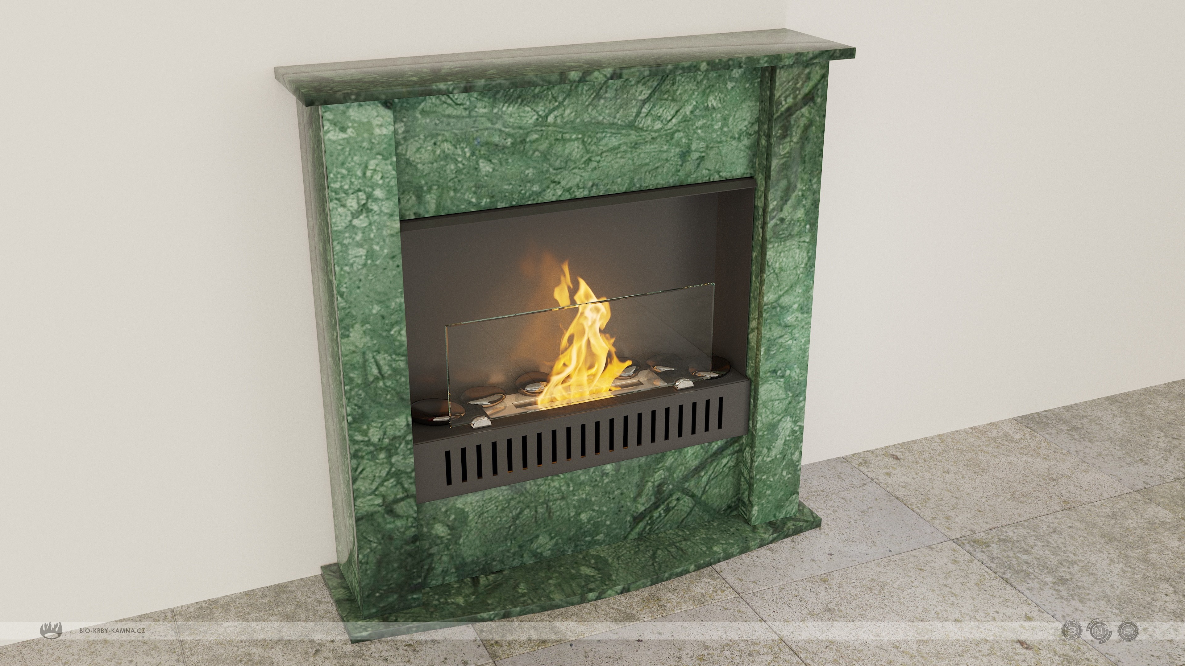 Čierna matná bio-vložka, krbová obstavba - prírodný kameň mramor Verde Guattemalla.