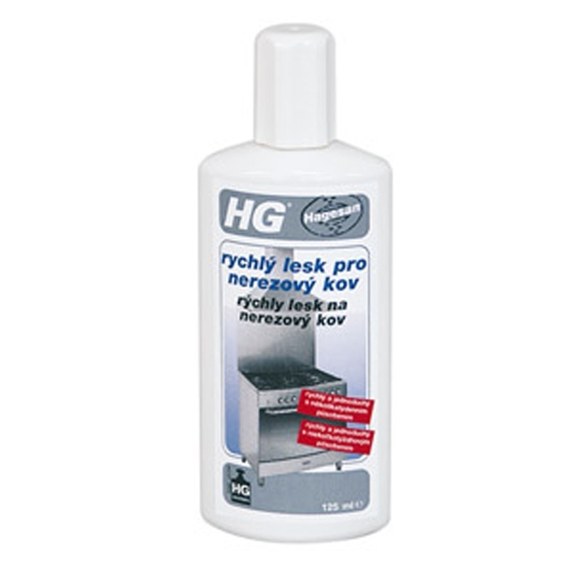 Prípravok HG rýchly lesk na nerezový kov dodá nerezovému kovu taký lesk ako nikdy predtým a stane sa tiež nepostrádateľným pomocníkom. HG rýchly lesk na nerezový kov je ošetrujúci a ochraňujúci prostriedok pripravený na priame použitie. Matným miestam dodá opäť lesk a naviac sa postará, aby sa špina a mastnota nedržala na povrchu. Vďaka tomu sa každodenné údržba podstatne uľahčí. Špeciálne zloženie minerálnych olejov sa starajú o dlhodobý efekt. Nerezový povrch je vhodné najskôr odmastiť napríklad pomocou prípravku HG odstraňovač mastnoty a nazávěr vytrieť dosucha. Následne naneste niekoľko kvapiek prípravku na nechlupatý suchý handru a pravidelne votrite do povrchu. Pre dosiahnutie ešte väčšieho lesku nechajte povrch 2 minúty schnúť a ešte raz prelesti čistou suchou handričkou.